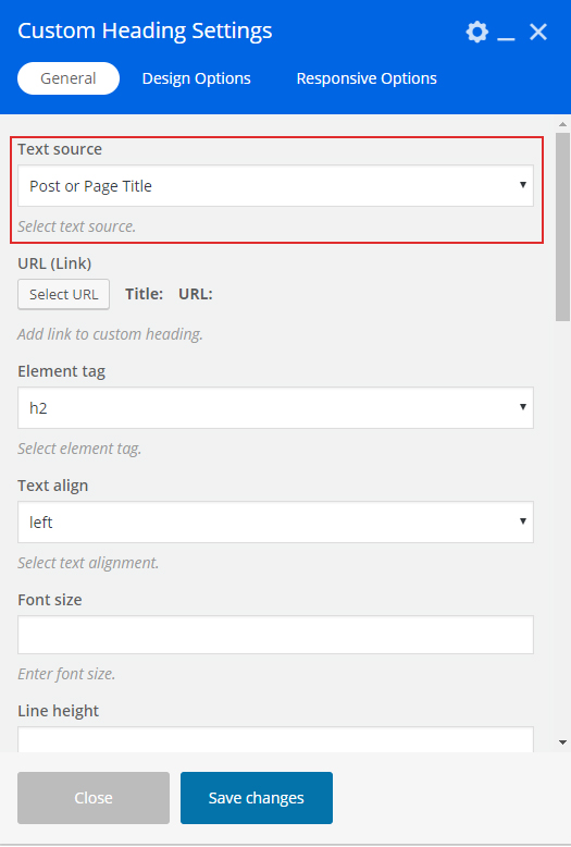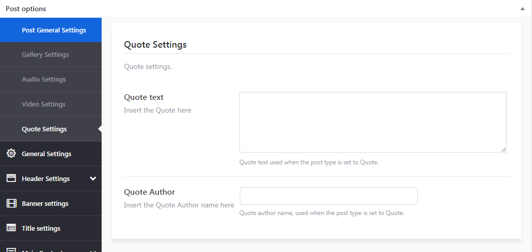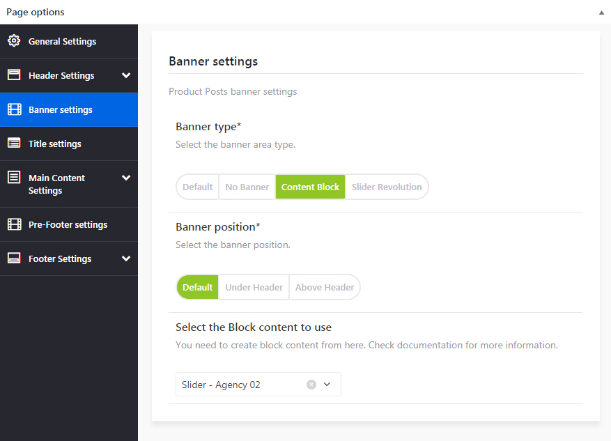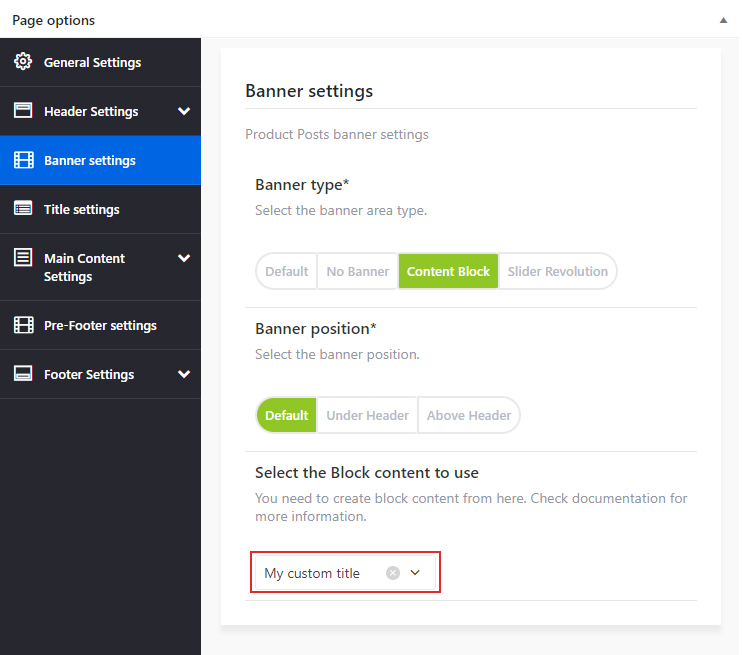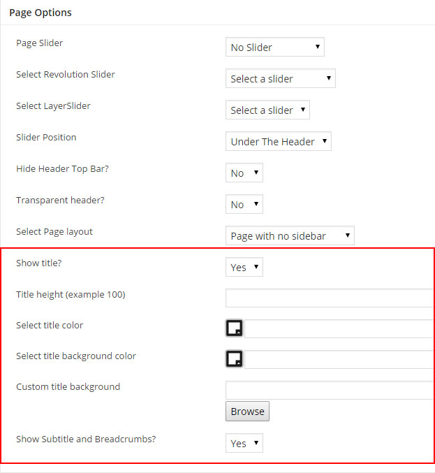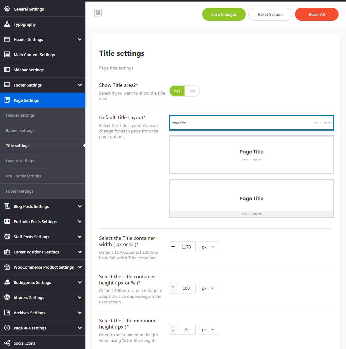 - TITLE: To modify the title and color settings you will need to go under Page Settings > Title settings to modify the page title settings, for the Blog title go to Blog settings > Title settings, each post type has its own title settings