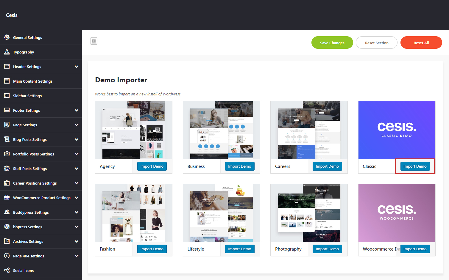 Step 3 - Then Click on Import Demo of the demo you wish to import. Classic demo will import all the pages you see on our demo site but not the single demo ( agency, business, fashion, lifestyle , photography etc).