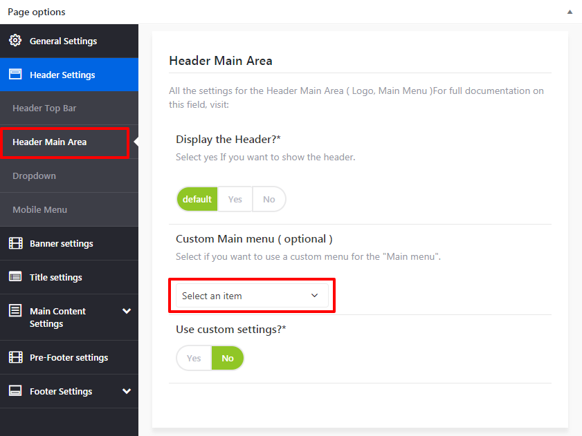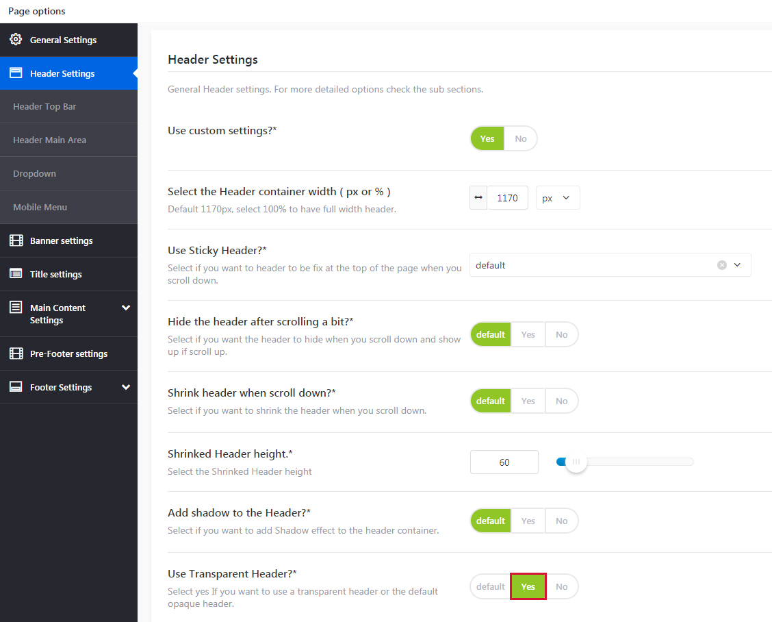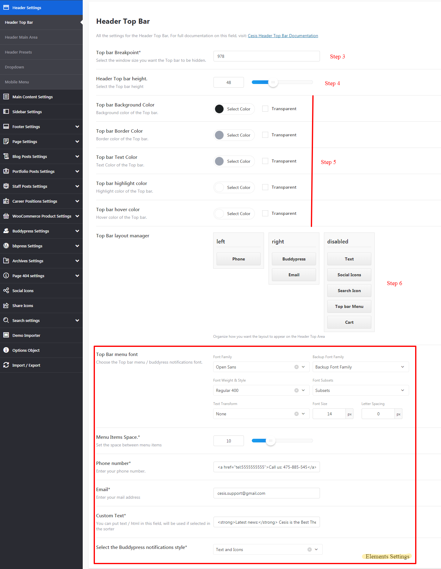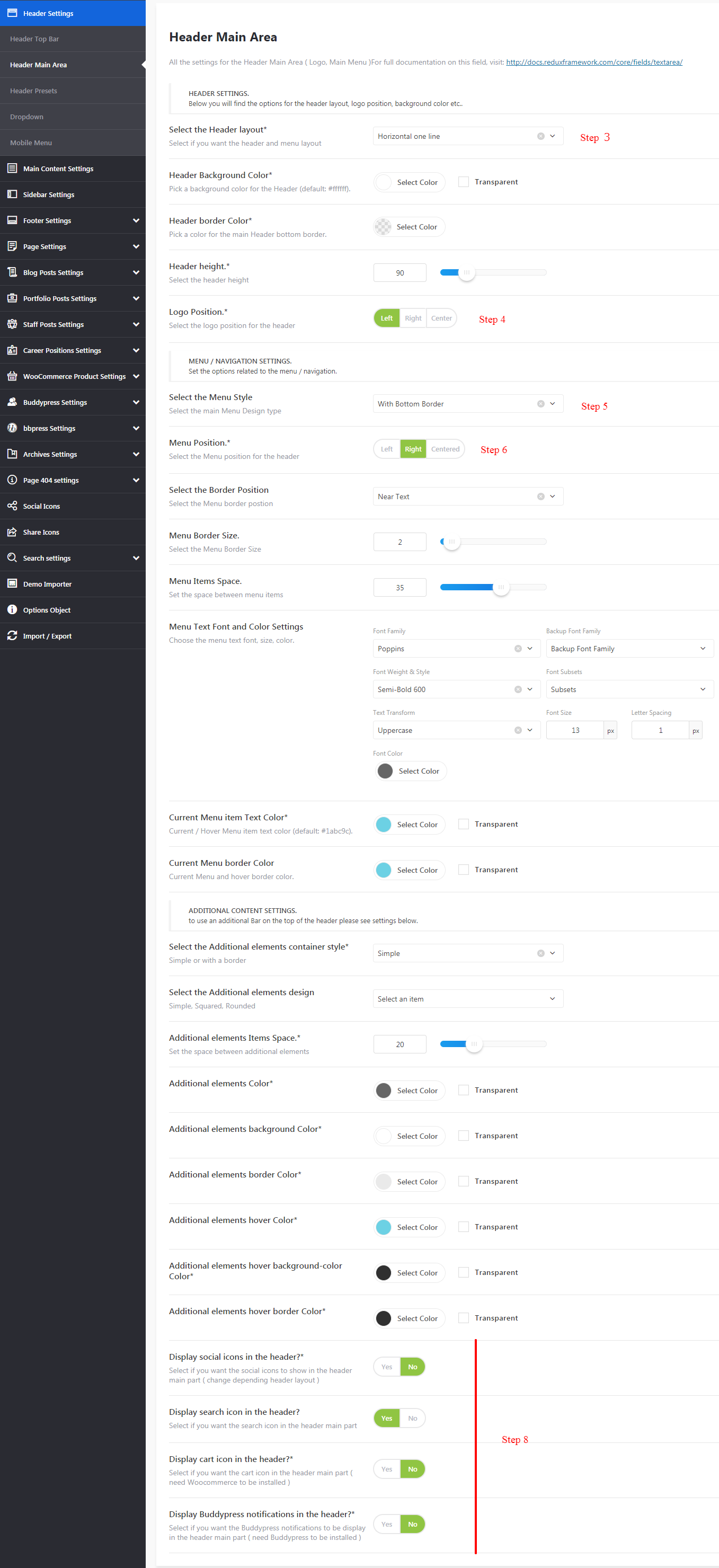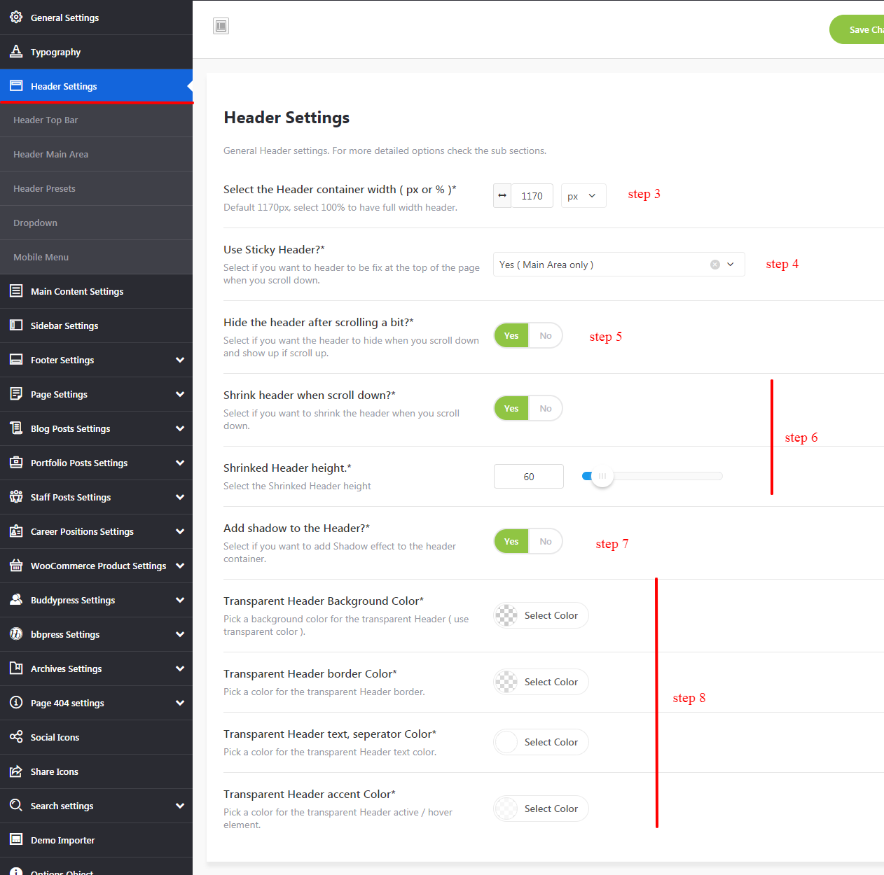 - Header Settings: To modify Header top bar, Header Main Area, Dropdown and Mobile Menu color