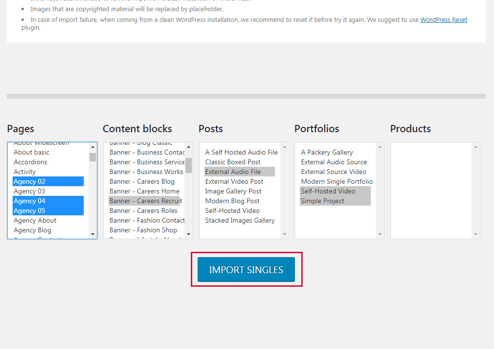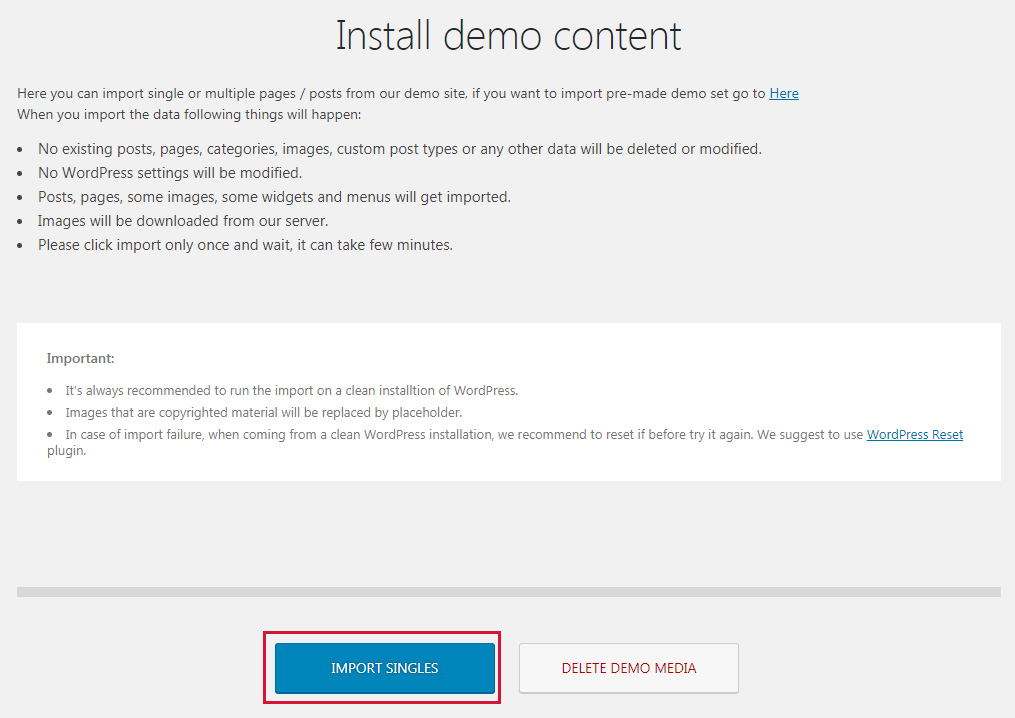 Theme panel demo importer will overwrite your settings and import the demo theme panel settings, if you don't need the theme settings check the single page importer