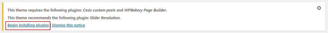 Step 6 - After activating the theme a notice should appear on the top of the screen, click on begin installing plugins ( see screenshots below ).
