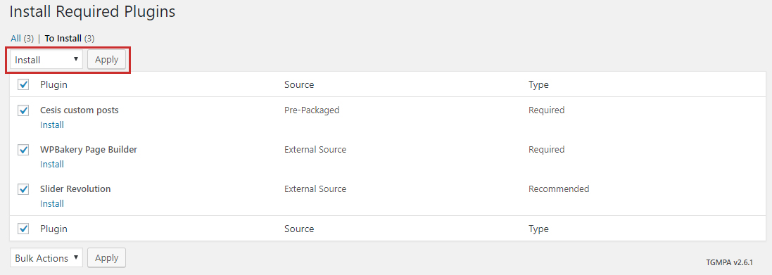 Step 7 - Select all the plugin,change Bulk Actions drop to Install then click apply ( see screenshots below ).