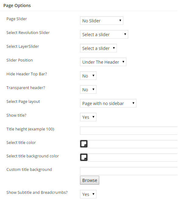 - TITLE: To modify the title and color settings you will need to go under Page Settings > Title settings to modify the page title settings, for the Blog title go to Blog settings > Title settings, each post type has its own title settings